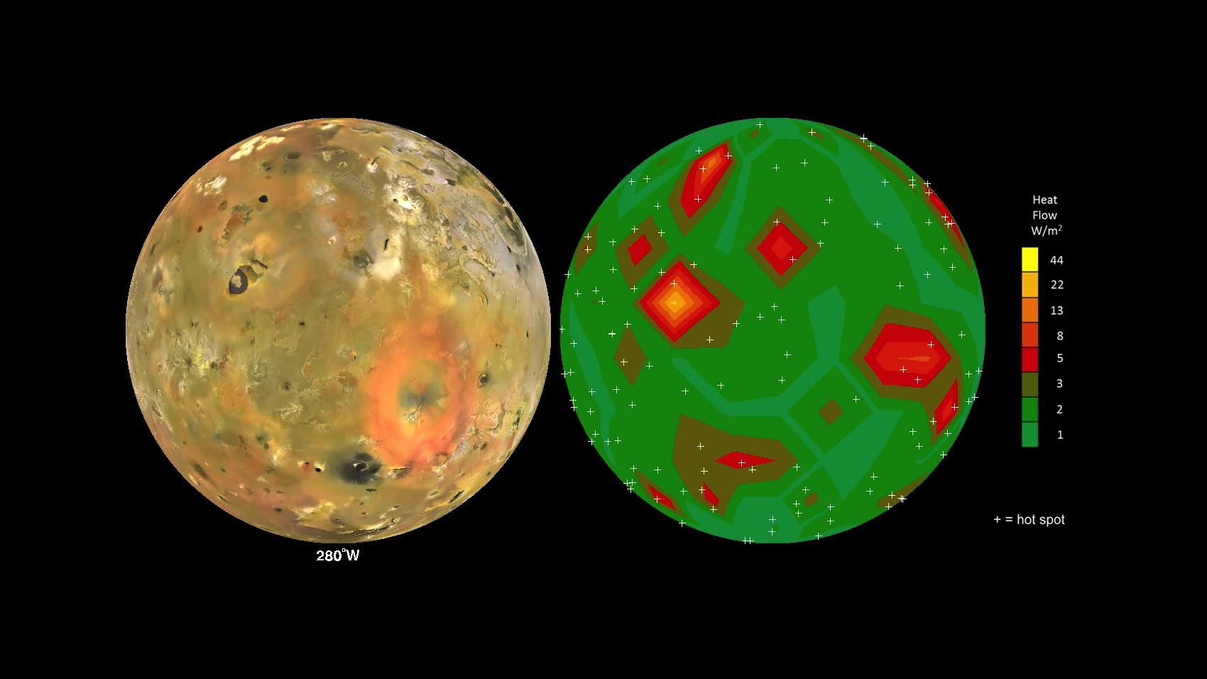 This animation shows Jupiter's volcanic moon Io as seen by NASA's Voyager and Galileo spacecraft (at left) and the pattern of heat flow from 242 active volcanoes (at right). The red and yellow areas are places where local heat flow is greatest -- the result of magma erupting from Io's molten interior onto the surface.
