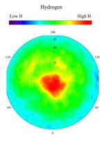 This gamma ray spectrometer map centered on the north pole of Mars is based on gamma-rays from the element hydrogen. In this region, hydrogen is mainly in the form of water ice. Regions of high ice content are shown in red and those low in ice content are shown in blue. The very ice-rich region at the north pole is due to a permanent polar cap of water ice on the surface. Elsewhere in this region, the ice is buried under several to a few tens of centimeters of dry soil. The sub-surface ice is not uniformly distributed in the north, but varies with both latitude and longitude. In the north, the soil is well over 50 percent ice, which is more than can be accommodated by just filling the pore space in pre-existing soil. This high ice content implies that the ice may have been slowly co-deposited with dust in the past when conditions were wetter. Deposition of ice by this process means it is more likely that the ice deposits are very thick and may even be deep enough to have liquid water at their base.