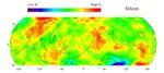 This gamma ray spectrometer map of the mid-latitude region of Mars is based on gamma-rays from the element silicon. Silicon is one of the most abundant elements on the surface of both Mars and Earth (second only to oxygen). The most extensive region of highest silicon content, shown in red, is located in the high latitudes north of Tharsis (centered near 45 degrees latitude, -120 degrees longitude). The area of lowest silicon content, shown in blue, lies just to the east of the Hellas Basin (-45 degrees latitude, 90 degrees longitude). Contours of constant surface elevation are also shown. The long continuous contour line running from east to west marks the approximate separation of the younger lowlands in the north from the older highlands in the south.