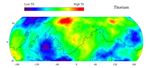 This gamma ray spectrometer map of the mid-latitude region of Mars is based on gamma-rays from the element thorium. Thorium is a naturally radioactive element that exists in rocks and soils in extremely small amounts. The region of highest thorium content, shown in red, is found in the northern part of Acidalia Planitia (50 degrees latitude, -30 degrees longitude). Areas of low thorium content, shown in blue, are spread widely across the planet with significant low abundances located to the north of Olympus Mons (near 55 degrees latitude, -155 degrees longitude), to the east of the Tharsis volcanoes (-10 degrees latitude, -80 degrees longitude) and to the south and east of Elysium Mons (20 degrees latitude, 160 degrees longitude). Contours of constant surface elevation are also shown. The long continuous contour line running from east to west marks the approximate separation of the younger lowlands in the north from the older highlands in the south.