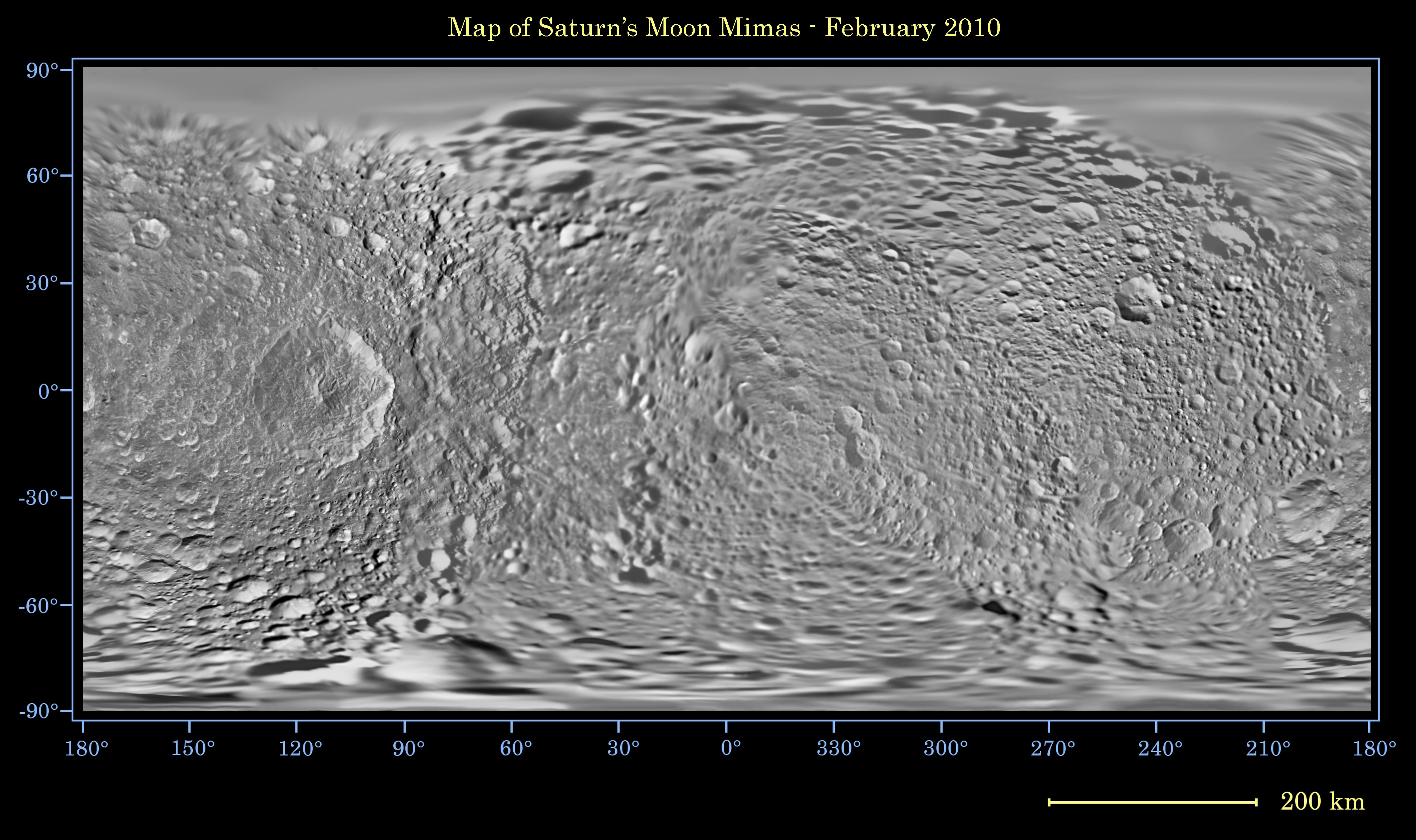 The map is an equidistant (simple cylindrical) projection and has a scale of 216 meters (710 feet) per pixel at the equator. The mean radius of Mimas used for projection of this map is 198.2 kilometers (123.2 miles). The resolution of the map is 16 pixels per degree. This mosaic map is an update to the version released in June 2008 (see PIA11118).