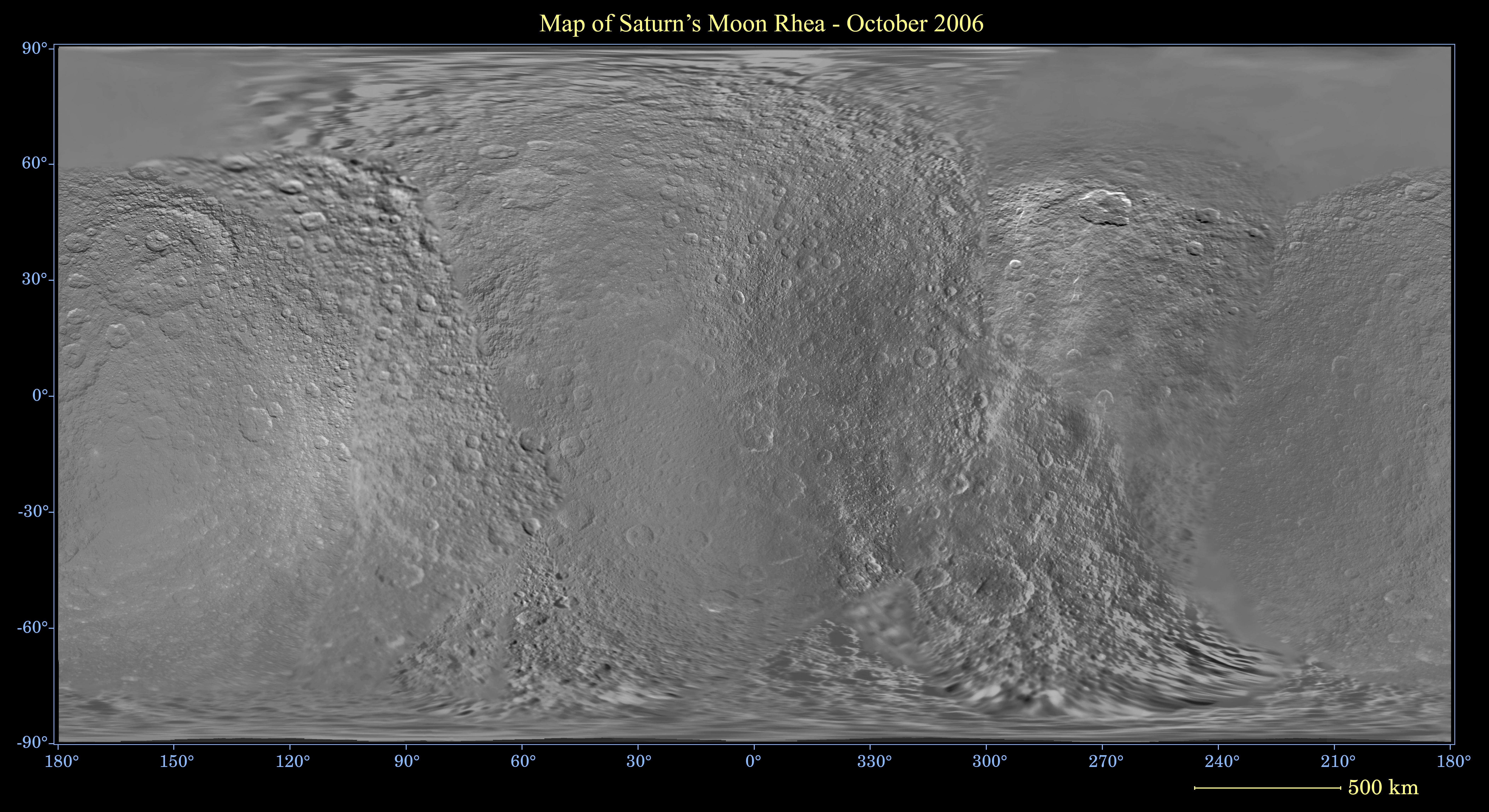 This global digital map of Saturn's moon Rhea was created using data taken during NASA's Cassini and Voyager spacecraft flybys. The map is an equidistant projection and has a scale of 700 meters (2,300 feet) per pixel. Equidistant projections preserve distances on a body, with some distortion of area and direction.