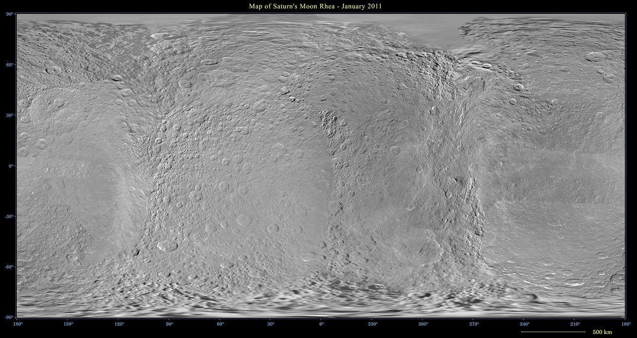 This map is an update to the version released in February 2010 (see PIA12561). This map contains data from Cassini's Jan. 11, 2011, flyby of Rhea. This map was created using primarily Cassini images. Six Voyager images fill gaps in Cassini's coverage of the north pole.