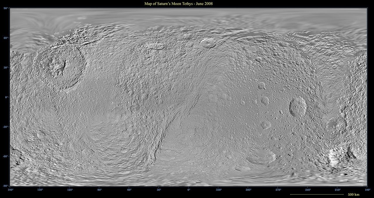 The map is an equidistant (simple cylindrical) projection and has a scale of 292.5 meters (959.6 feet) per pixel at the equator. The mean radius of Tethys used for projection of this map is 536.3 kilometers (333.2 miles). The resolution of the map is 32 pixels per degree. This map is an update to the version released in February 2008, see PIA08407.