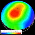 During the first year of MESSENGER's orbital mission, the spacecraft's GRS instrument measured the elemental composition of Mercury's surface materials. Among the most important discoveries from the GRS was the observation of higher abundances of the moderately volatile elements potassium, sodium, and chlorine than expected from previous scientific models and theories. Particularly high concentrations of these elements were observed at high northern latitudes, as illustrated in this potassium abundance map, which provides a view of the surface centered at 60° N latitude and 120° E longitude. This map was the first elemental map ever made of Mercury's surface and is to-date the only map to report absolute elemental concentrations, in comparison to element ratios.