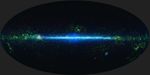 In the mosaic, the Milky Way Galaxy runs horizontally across this map. The Milky Way is shaped like a disk and our solar system is located in that disk about two-thirds of the way out from the center. So we see the Milky Way as a band running through the sky. As we look toward the center of the galaxy, we are looking through more of the disk than when we are looking at large angles away from the center, and you can see a noticeable increase in stars (colored blue-green) toward the center of the image.