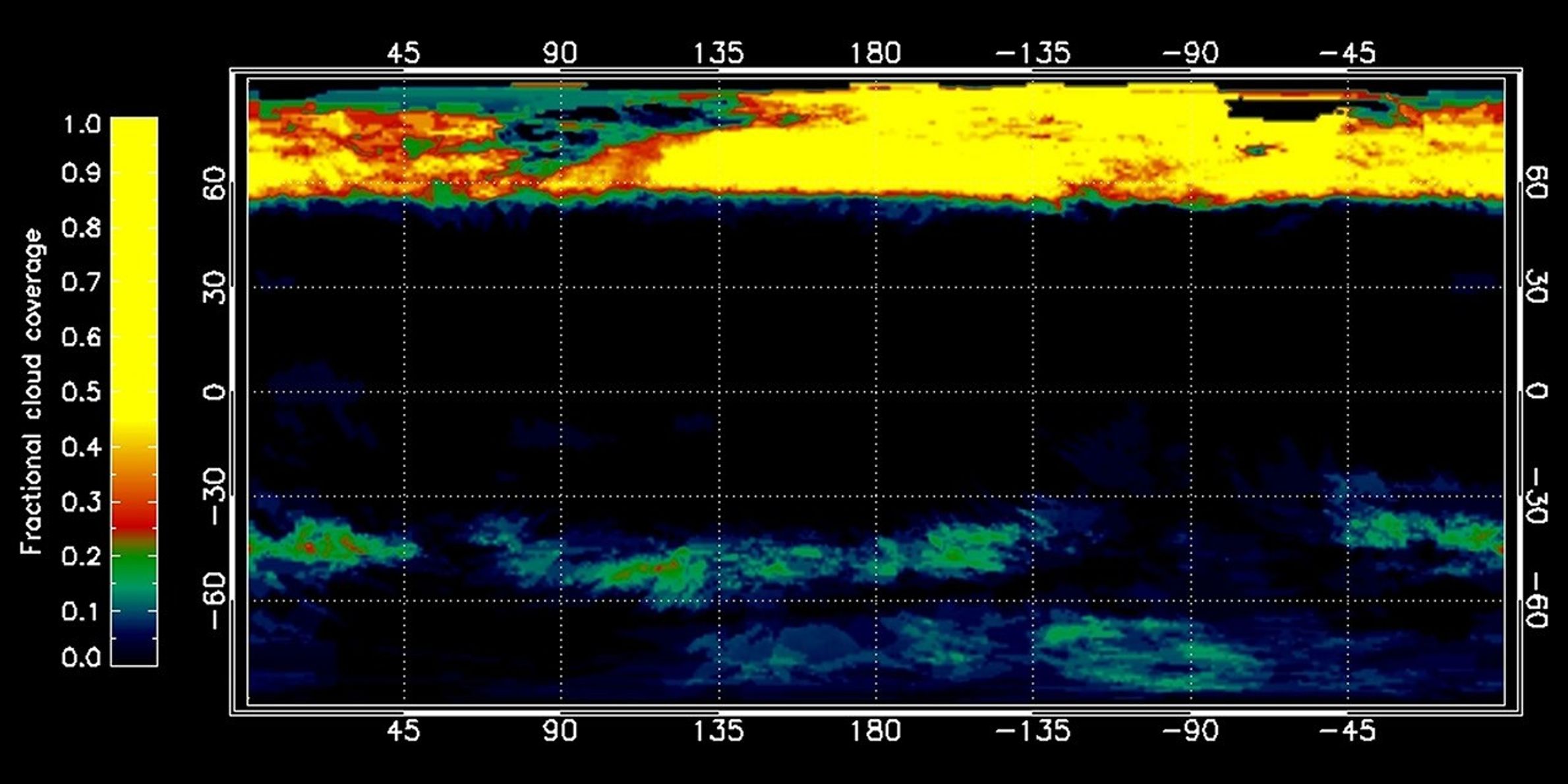 This graphic, constructed from data obtained by NASA's Cassini spacecraft, shows the percentage of cloud coverage across the surface of Saturn's moon Titan. The color scale from black to yellow signifies no cloud coverage to complete cloud coverage, over a period spanning July 2004 to April 2010.