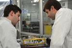 Engineers for NASA's MarCO (Mars Cube One) technology demonstration inspect one of the two MarCO CubeSats. Cody Colley, MarCO integration and test deputy, left, and Andy Klesh, MarCO chief engineer, are on the team at NASA's Jet Propulsion Laboratory, Pasadena, California, preparing twin MarCO CubeSats.