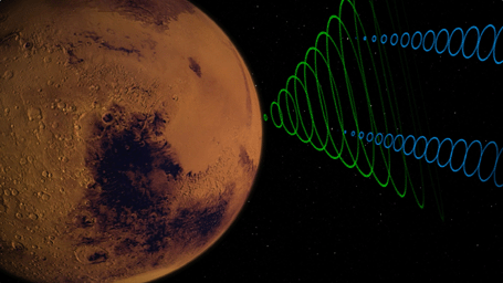 This animation depicts the MarCO CubeSats relaying data (blue) from NASA's InSight lander (green) as InSight enters the Martian atmosphere.