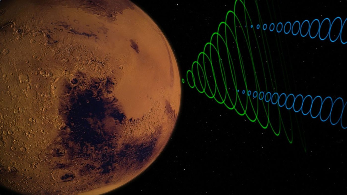 This animation depicts the MarCO CubeSats relaying data (blue) from NASA's InSight lander (green) as InSight enters the Martian atmosphere.