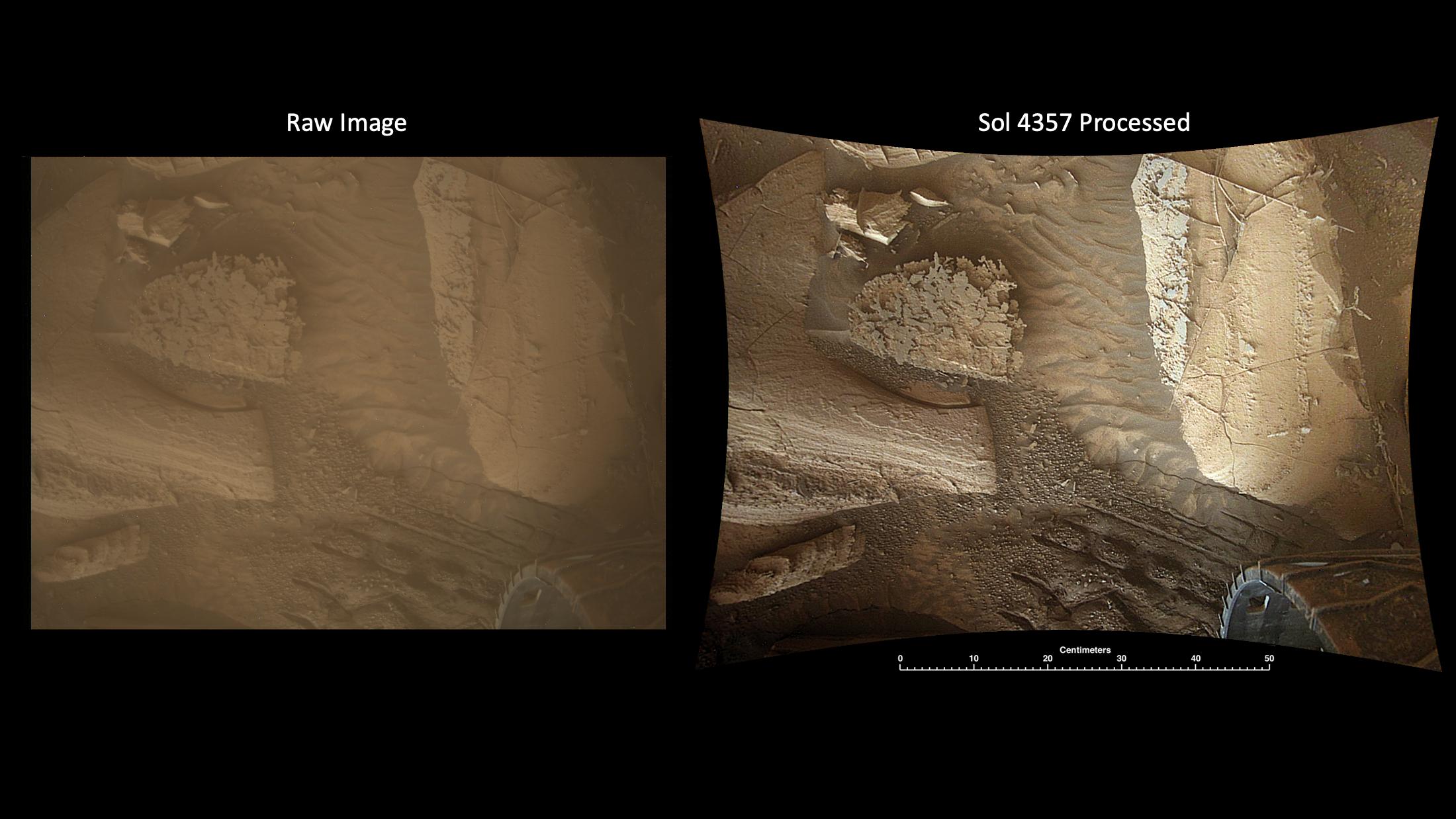 The first version of the pair of images above was processed onboard the rover into a color image. Once scientists back on Earth receive such images, they perform additional processing to improve contrast and sharpness, and to correct for distortions caused by the camera's fisheye lens (the curved edges of the final image are the result of correcting for those distortions).
