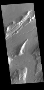 The linear depressions in this VIS image are called Mareotis Fossae. They are part of a huge region of graben that comprise Tempe Terra. The graben of Mareotis Fossae trend to the northeast, parallel to the fossae of Alba Mons located just to the west of Tempe Terra.