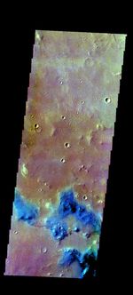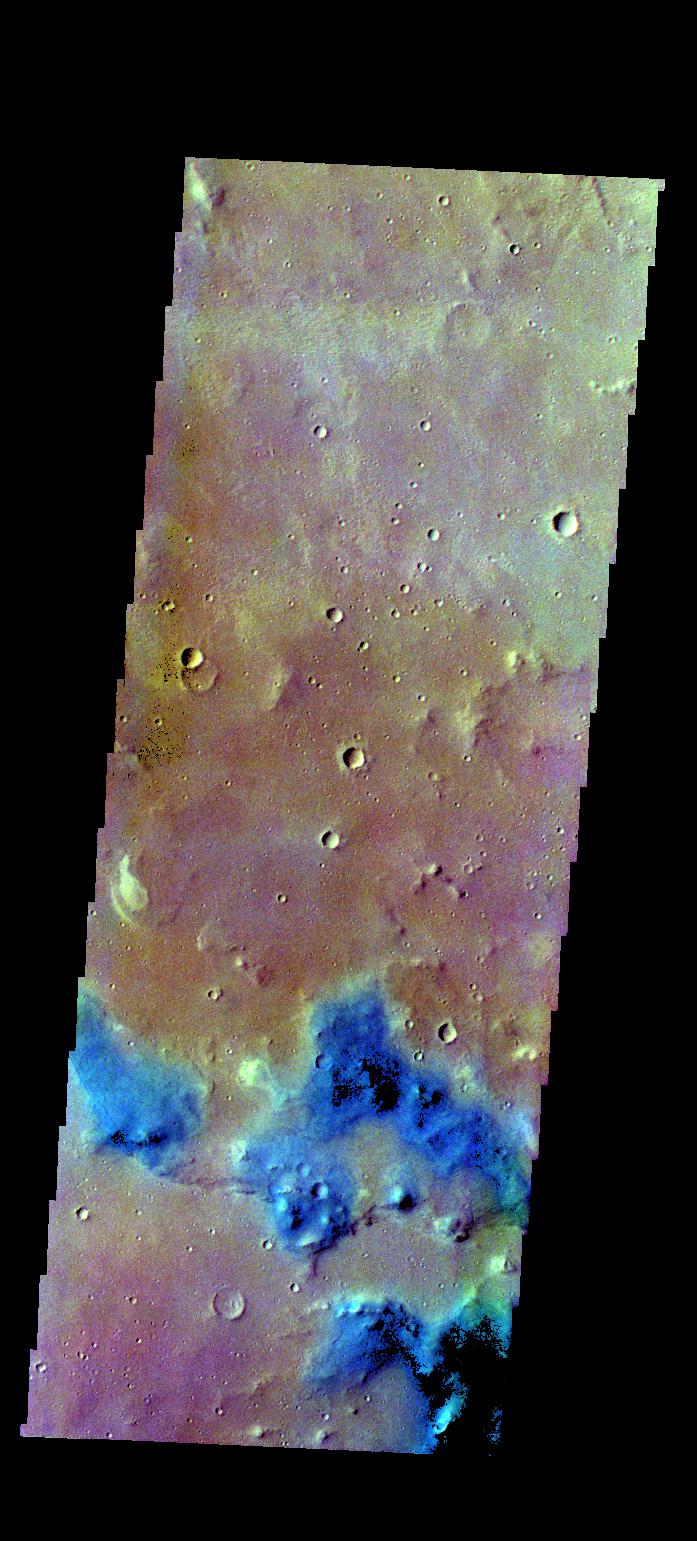 The THEMIS VIS camera contains 5 filters. The data from different filters can be combined in multiple ways to create a false color image. These false color images may reveal variations of the surface not easily identified in a single band image. Today's false color image shows part of Margaritifer Terra. Dark blue in this band configuration often equates with sand or basaltic materials.