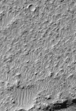 The picture on the right represents an improvement in resolution of almost a factor of 400. It shows a view of a tiny portion of the southeastern floor of Mariner Crater, as it appeared to the MGS MOC in 1999. In 1965, it was a surprise to find that the martian surface is pocked with craters. In 1999, using the MGS MOC, we now have the ability to see objects the size of automobiles on the martian surface. This view of the Mariner Crater floor has a spatial resolution of 1.5 meters (5 feet) per pixel and covers an area only 1.5 km (0.9 mi) wide by 2.2 km (1.4 mi) long. Illumination is from the upper left in both the Mariner and MGS images. For a mercator-projected Viking 1 Orbiter view of this crater (obtained in 1978)click here.