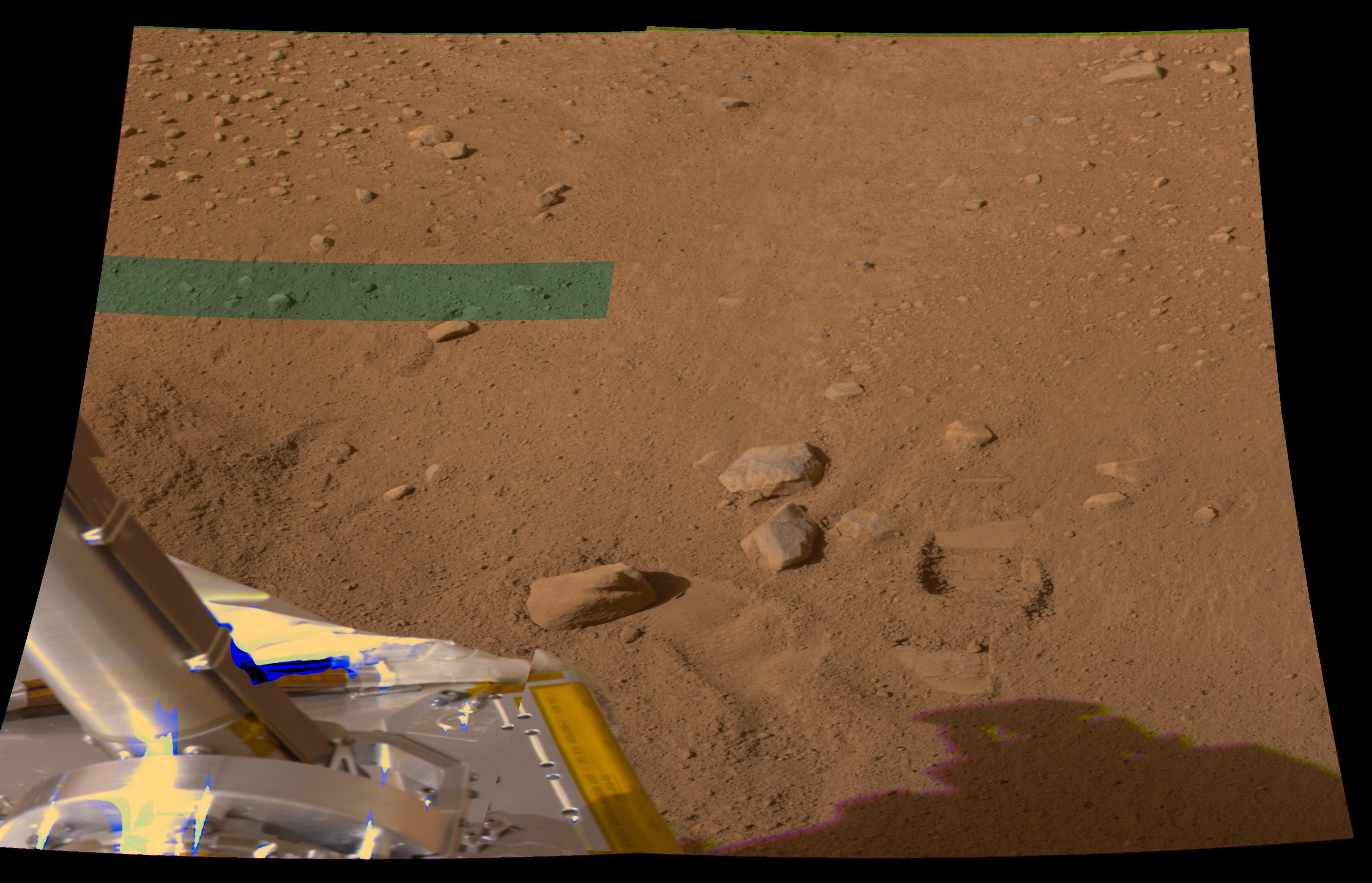 The hole is the width of the scoop on the end of the arm, about 9 centimeters (3.5 inches). It resulted from a practice dig during the mission's seventh Martian day, or sol 7 (June 1, 2008). The lander's Surface Stereo Imager took this image later that sol. The image is in approximately true color, produced by combining exposures taken through different filters. The green band at upper left is a portion where imaging data was incomplete in for one of the filters.