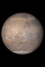 The view of Mars shown here was assembled from MOC daily global images obtained on May 12, 2003. At that time, the northern hemisphere was in early autumn, and the southern hemisphere in early spring. At the left/center of this view are the four large Tharsis volcanoes: Olympus Mons, Ascraeus Mons, Pavonis Mons, and Arsia Mons. Stretching across the center of the globe is the ~5,000 kilometers (~3,000 miles) long Valles Marineris trough system. The seasonal south polar carbon dioxide frost cap is visible at the bottom of this view. A dust storm sweeps across the plains of northern Acidalia at the upper right. North is up, east is right, sunlight illuminates the planet from the left.