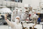 Members of NASA's Mars 2020 project take a moment after attaching the remote sensing mast to the Mars 2020 rover.