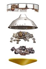 This illustration depicts five major components of the Mars 2020 spacecraft. Top to bottom: cruise stage, backshell, descent stage, Perseverance rover and heat shield. The various components perform critical roles during the vehicle's cruise to Mars and its dramatic entry, descent, and landing.
