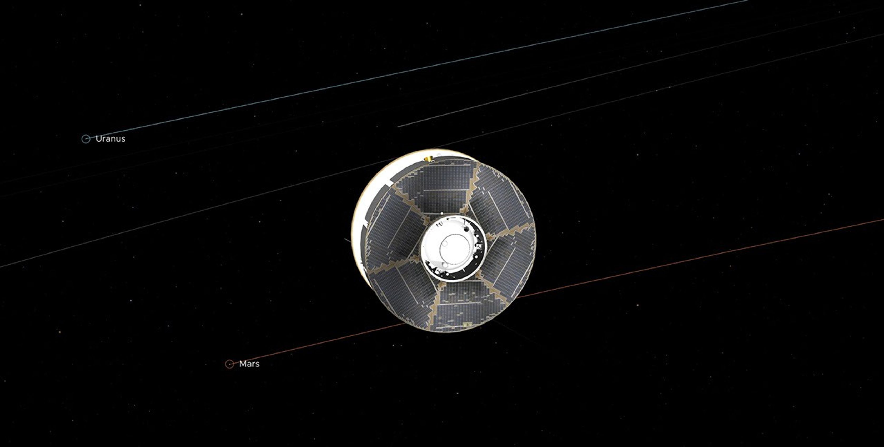 This illustration of the Mars 2020 spacecraft (the solar-panel-covered cruise stage most visible here along with a portion of the white back shell) in interplanetary space was generated using imagery from NASA's Eyes on the Solar System. The image is from the mission's midway point between Earth and Mars — 146.3 million miles (235.4 million kilometers) away from each. In straight-line distance, Earth is 26.6 million miles (42.7 million kilometers) behind Perseverance, and Mars is 17.9 million miles (28.8 million kilometers) in front. Visible in the graphic are the solar panels on the cruise stage surrounding the top of the aeroshell.