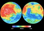 These two views of Mars are derived from the MGS Thermal Emission Spectrometer (TES) measurements of global broadband (0.3 - ~3.0 microns) visible and near-infrared reflectance, also known as albedo. The range of colors are in dimensionless units. The values are the ratio of the amount of electromagnetic energy reflected by the surface to the amount of energy incident upon it from the sun (larger values are brighter surfaces).