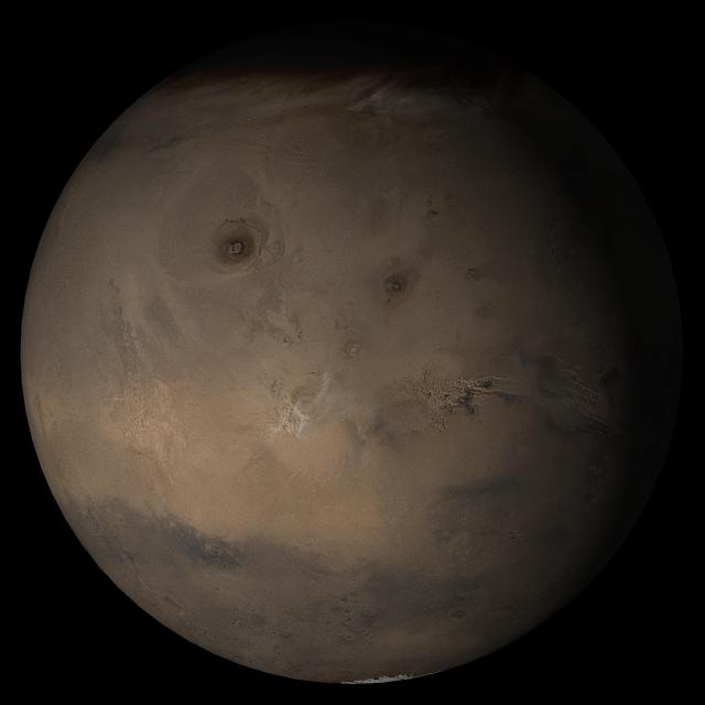 This picture is a composite of Mars Global Surveyor (MGS) Mars Orbiter Camera (MOC) daily global images acquired at Ls 269° during a previous Mars year. This month, Mars looks similar, as Ls 269° occurs in mid-August 2005. The picture shows the Tharsis face of Mars. Over the course of the month, additional faces of Mars as it appears at this time of year are being posted for MOC Picture of the Day. Ls, solar longitude, is a measure of the time of year on Mars. Mars travels 360° around the Sun in 1 Mars year. The year begins at Ls 0°, the start of northern spring and southern autumn.