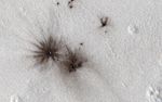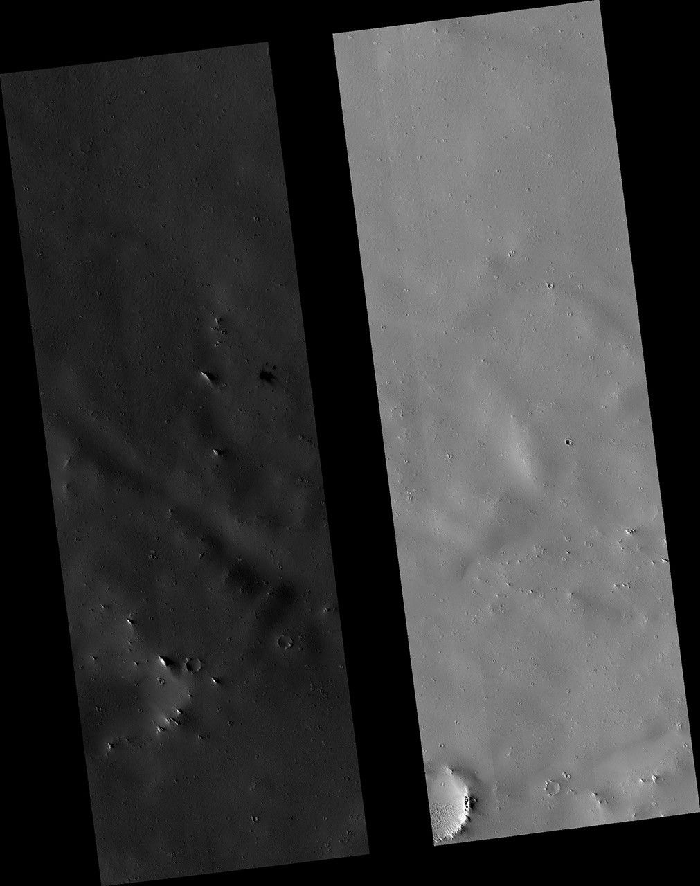 CTX is more adept at identifying new impacts because of its larger and repeated surface coverage, but HiRISE allows us to study those impacts in higher resolution. In this image, we can see multiple dark spots corresponding to numerous new craters. We can also identify a slightly larger crater, and a number of smaller ones, particularly in a cluster next to it. That clustering gives us the first indication that these craters were formed in a single event.