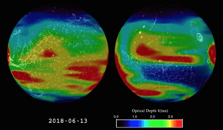 This animation shows the evolution of the 2018 Mars global dust storm from late May to September. The animation shows the optical depth tau -- a measure of how much light is being blocked by atmospheric dust as measured by the Mars Climate Sounder instrument onboard NASA's Mars Reconnaissance Orbiter.