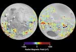 The radial magnetic field measured is color coded on a global perspective view that shows measurements derived from spacecraft tracks below 200 km overlain on a monochrome shaded relief map of the topography.