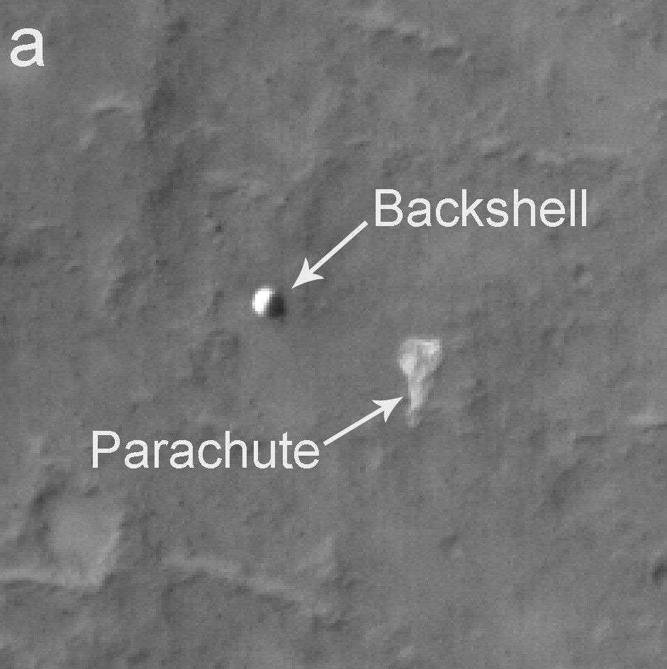 The bright irregularly shaped feature in area "a" of the image is Spirit's parachute, now lying on the Martian surface. Near the parachute is the cone-shaped back shell, which helped protect Spirit's lander during its seven-month journey to Mars. The back shell appears relatively undamaged by its impact with the Martian surface. Wrinkles and folds in the parachute fabric are clearly visible.