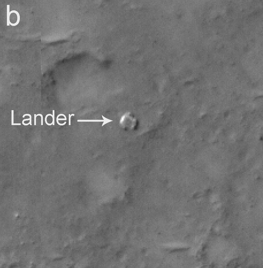 Area "b" of the image shows Spirit's lander. The crater in the upper left portion of the image, just northwest of the lander, was informally named "Sleepy Hollow" by the Mars Exploration Rover team.