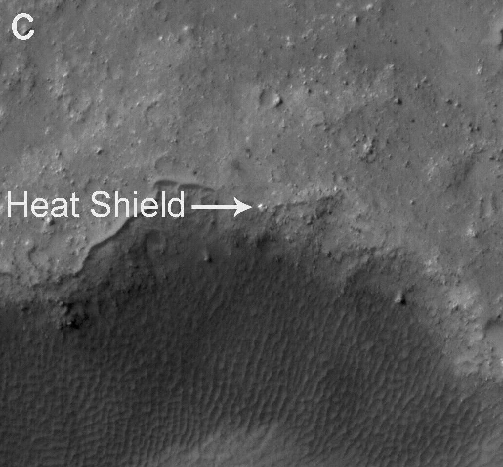 Area "c" of the image shows Spirit's heat shield at the edge of Bonneville Crater.