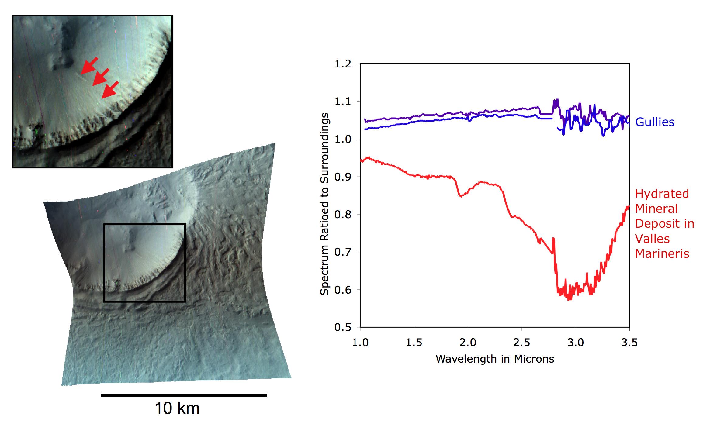 This CRISM image of a bright gully deposit was constructed by showing 2.53, 1.50, and 1.08 micrometer light in the red, green, and blue image planes. CRISM can just resolve the deposits (highlighted by arrows in the inset), which are only a few tens of meters (about 150 feet) across. The spectrum of the deposits barely differs from that of the surrounding material, and is just a little brighter. This difference could simply be explained by a slightly greater content of dust than in the surrounding soil. In contrast, older deposits elsewhere on Mars ( such as Valles Marineris) that do contain hydrated salts have distinctive spectral features near 1.9 and 3.0 microns. The gully deposits lack these features, and exhibit no evidence for water-deposited salts. Just-published HiRISE images of this and other bright gully deposits do not rule out water, but they do suggest that the bright deposits could also have formed by dust that slid downslope and accumulated in the gullies.