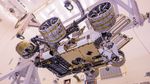 The Mars Helicopter, visible in lower center of the image, was attached to the belly of NASA's Perseverance rover at Kennedy Space Center on April 6, 2020. The helicopter will be deployed onto the Martian surface about two-and-a-half months after Perseverance lands.