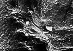 This high-resolution scanning electron microscope image shows an unusual tube-like structural form that is less than 1/100th the width of a human hair in size found in meteorite ALH84001, a meteorite believed to be of Martian origin. Although this structure is not part of the research published in the Aug. 16 issue of the journal Science, it is located in a similar carbonate glob in the meteorite. This structure will be the subject of future investigations that could confirm whether or not it is fossil evidence of primitive life on Mars 3.6 billion years ago.