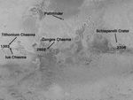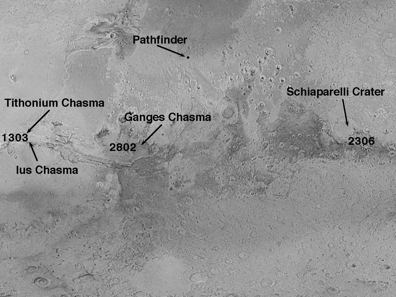 This U.S. Geological Survey shaded relief map provides an overall context for the MGS MOC images of the Tithonium/Ius Chasma, Ganges Chasma, and Schiaparelli Crater. Closeup images of the Tithonium/Ius Chasma area are visible in PIA01021 through PIA01023. Closeups of Ganges Chasma are available as PIA01027 through PIA01029, and Schiaparelli Crater is shown in PIA01024 through PIA01026. The Mars Pathfinder landing site is shown to the north of the sites of the MGS images.