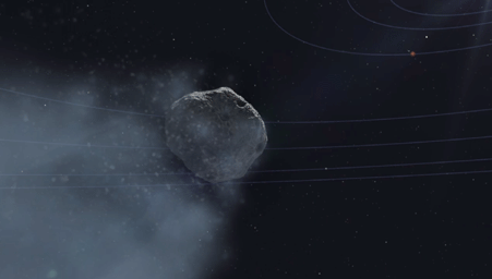 This frame from an animated artist's rendering begins with NASA's Mars Reconnaissance Orbiter spacecraft above Mars. The movie then transitions to a sequence of HiRISE images of the comet taken as it flew past Mars.