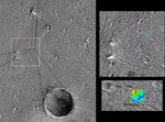 Bottom right image: Location of Mars Pathfinder landing site in MOC image 25603. The lander is located in the center of the white box. The original resolution of the MOC image was about 3.3 meters (11 feet) per pixel; however, because the region was hazy at the time the picture was taken, the effective resolution is only about 5 meters (16.4 feet) per pixel. Thus, the lander and rover are too small to actually be seen in the image. The colored box, 120 m (just under 400 ft) on a side, is the topographic map of the landing site. The topographic map was made using the stereographic images taken by Mars Pathfinder in 1997. Low areas-- depressions--are blue and purple, high areas--hill--are shown as red. The range of heights is actually fairly small--a total of 4 m (about 13 ft) from dark purple to bright red. The lander is represented within the black dot at the center of the map. A preliminary version of the topographic map that is generally similar to this more refined version was published in Science, v. 278, p. 1736, December 5, 1997.