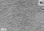 This picture is an enlargement of a portion of a MOC image taken in late July 1999, showing the onset of defrosting of the seasonal carbon dioxide frost cap (small, occasionally fan-shaped dark spots seen throughout this image). Two craters are seen in this image, a very rare occurrence on the south polar layered deposits. Shown for comparison at the same scale is a picture of Jack Murphy (now Qualcomm) Stadium in San Diego, California. Clearly visible in the inset is the baseball diamond and pitcher's mound; less clear but certainly visible are a number of automobiles (small light dots) in the parking lot west (to the left) of the stadium. The elevation of the sun in the Mars image is about 10°; the sunlight is coming from the bottom (north) in this image. The shadow of the rims of the craters can be used to determine their depths. The smaller crater in the bottom right corner is about 60 m (197 feet) across and 7 m (23 feet) deep; the large crater just below the inset is 175 m (574 feet) across and 17 m (56 feet) deep. Similar calculations for other features in the images indicate that much of the surface is smooth and flat. Relief is typically much less than 1-2 meters (3-7 feet) in height over areas of 10-15 meters across (33-49 feet).