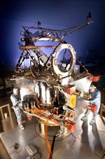 Lockheed Martin Space Systems engineer Terry Kampmann (left) and lead technician Jack Farmerie work on assembly and test of NASA's Mars Reconnaissance Orbiter spacecraft bus in a cleanroom at the company's Denver facility. In coming months, the orbiter's science instruments will be integrated and tested, followed by environmental testing of the completed spacecraft. Launch of Mars Reconnaissance Orbiter is scheduled for August 2005.