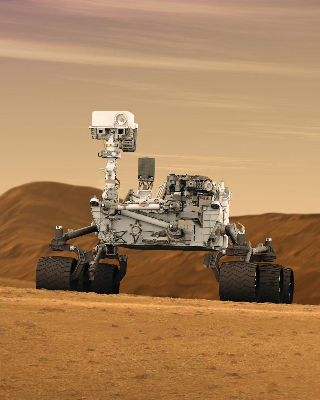 This artist concept features NASA's Mars Science Laboratory Curiosity rover, a mobile robot for investigating Mars' past or present ability to sustain microbial life. Curiosity is being tested in preparation for launch in the fall of 2011.