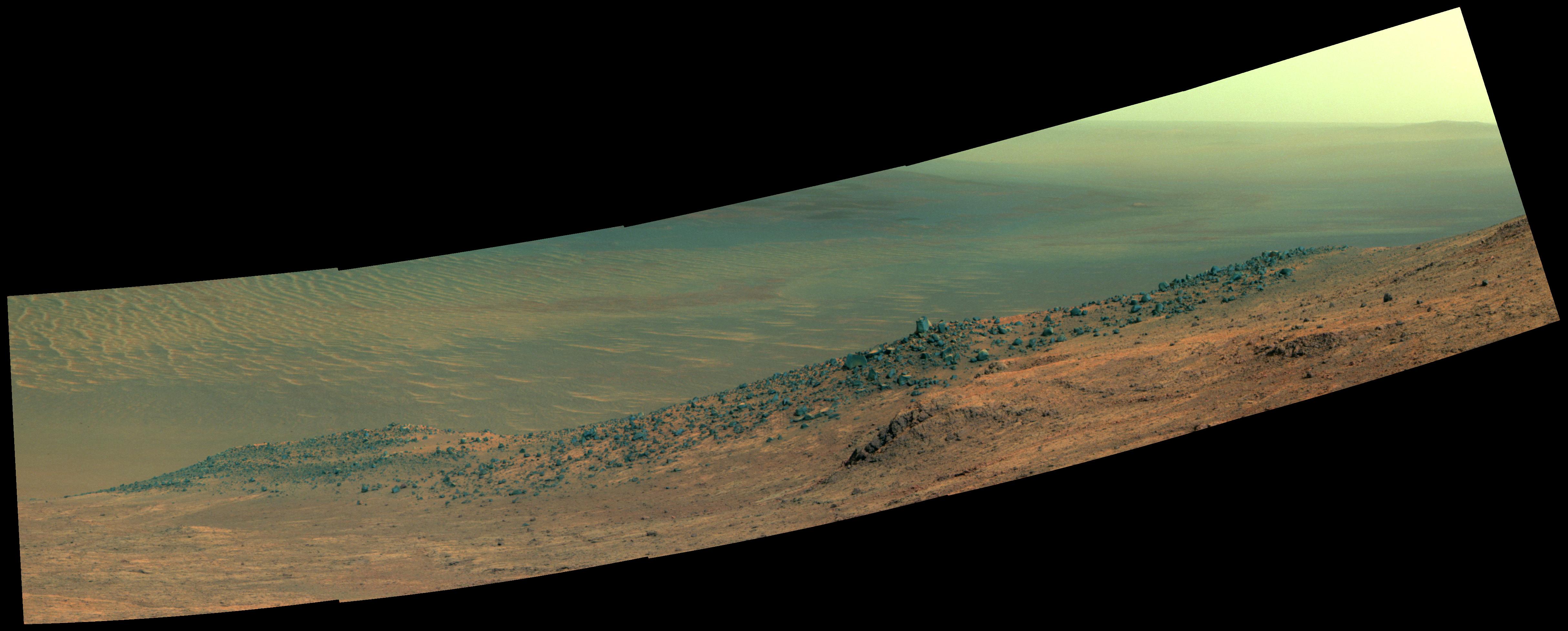 The view spans from east-northeast at left to southeast at right. Color in the scene comes from component images taken through three of the Pancam's color filters, centered on wavelengths of 753 nanometers (near-infrared), 535 nanometers (green) and 432 nanometers (violet).
