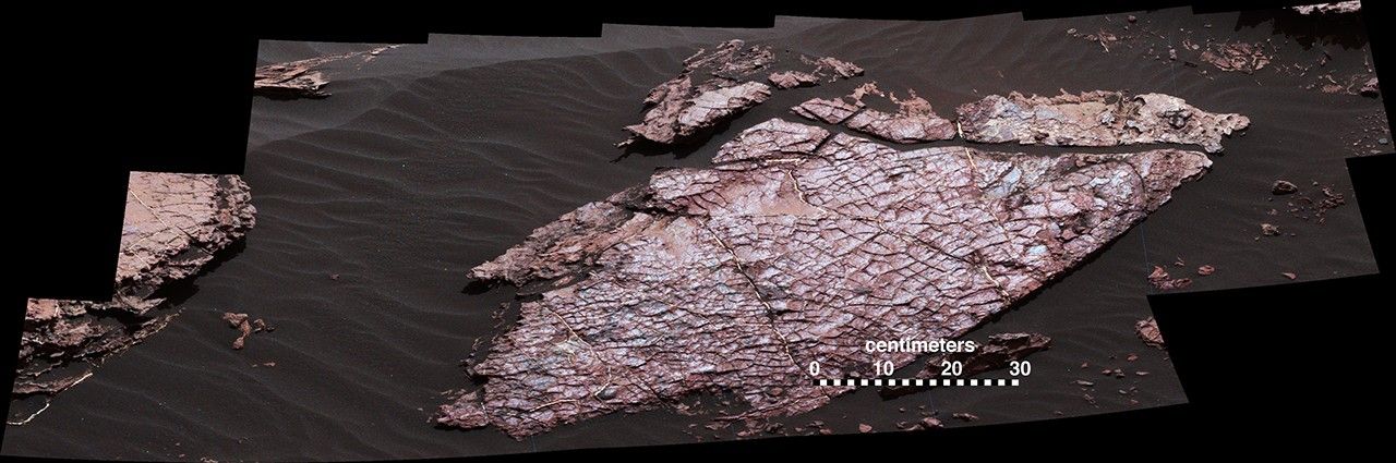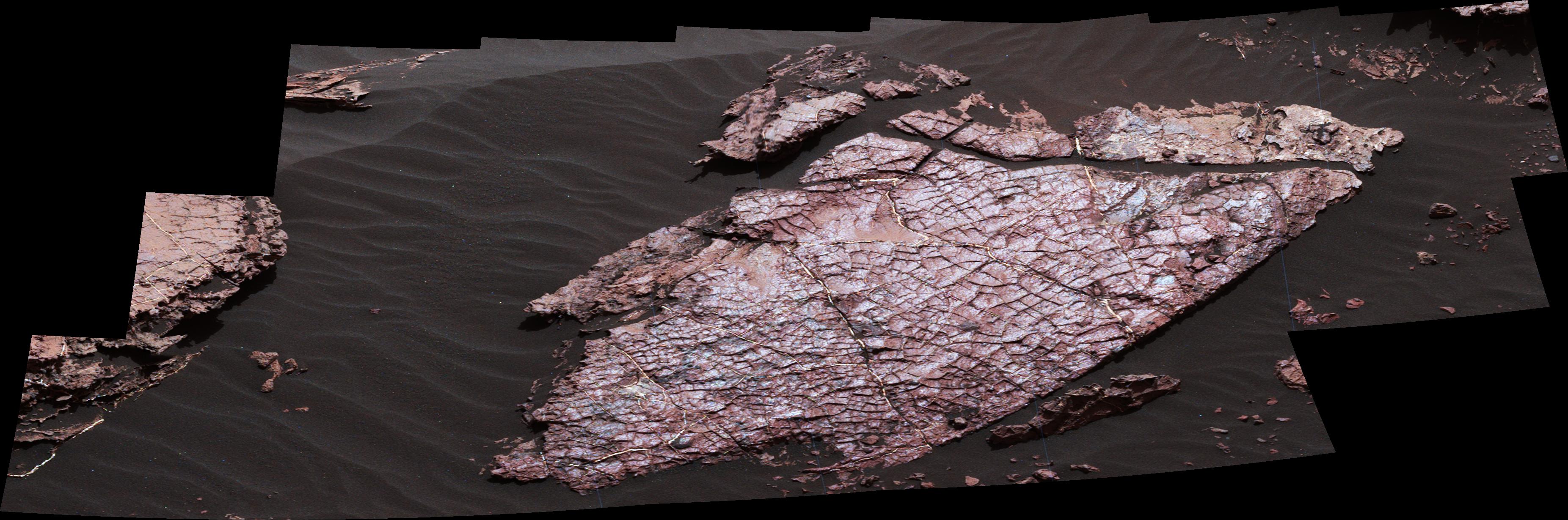 This view of a Martian rock slab called "Old Soaker," which has a network of cracks that may have originated in drying mud, comes from the Mast Camera (Mastcam) on NASA's Curiosity Mars rover.