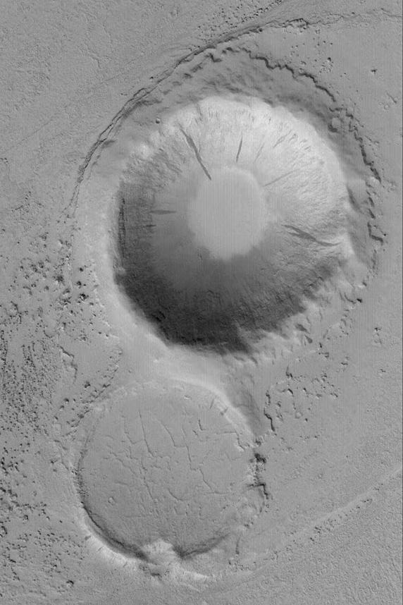 Marte Valles is an outflow channel system that straddles 180°W longitude between the region south of Cerberus and far northwestern Amazonis. The floor of the Marte valleys have enigmatic platy flow features that some argue are formed by lava, others suggest they are remnants of mud flows. This Mars Global Surveyor (MGS) Mars Orbiter Camera (MOC) image shows an island created in the middle of the main Marte Valles channel as fluid---whether lava or mud---flowed past two older meteor impact craters. The craters are located near 21.5°N, 175.3°W. The image covers an area about 3 km (1.9 mi) across. Sunlight illuminates the scene from the lower left.