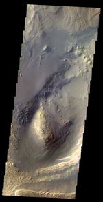 Note: this THEMIS visual image has not been radiometrically nor geometrically calibrated for this preliminary release. An empirical correction has been performed to remove instrumental effects. A linear shift has been applied in the cross-track and down-track direction to approximate spacecraft and planetary motion. Fully calibrated and geometrically projected images will be released through the Planetary Data System in accordance with Project policies at a later time.