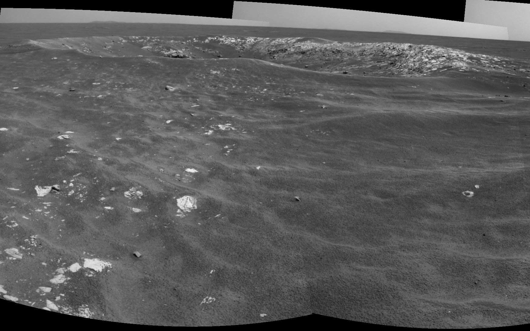 NASA's Mars Exploration Rover Opportunity recorded this view of a crater informally named "Freedom 7" shortly before the 50th anniversary of the first American in space: astronaut Alan Shepard's flight in the Freedom 7 spacecraft.