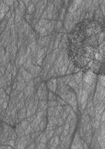 This Mars Global Surveyor (MGS) Mars Orbiter Camera (MOC) image shows a variety of textures observed on a south middle-latitude plain east-southeast of Hellas Planitia. Dark streaks left by passing dust devils are practically ubiquitous across the scene, including the transition from the texturally-smooth area (the majority of the image) onto the circular, rough feature near the right (east) edge of the image. The circular feature might once have been the site of an impact crater; perhaps this is the remains of its floor, and the rest of the crater and the rock in which it formed was removed by erosion.