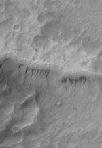 This Mars Global Surveyor (MGS) Mars Orbiter Camera (MOC) image shows a gullied crater wall at 1.5 meters (5 feet) per pixel resolution. The gullies in this case have formed in a thick, smooth-surfaced mantle that covers the crater wall. Formation of these gullies might have involved a fluid such as water, or perhaps could have formed by avalanching of dry debris. The Mars science community is still discussing, debating, and making new observations of martian gullies to better understand their origin and implications. These gullies are located near 33.8°S, 201.6°W. The image covers an area about 3 km (1.9 mi) across. Sunlight illuminates the scene from the upper left.