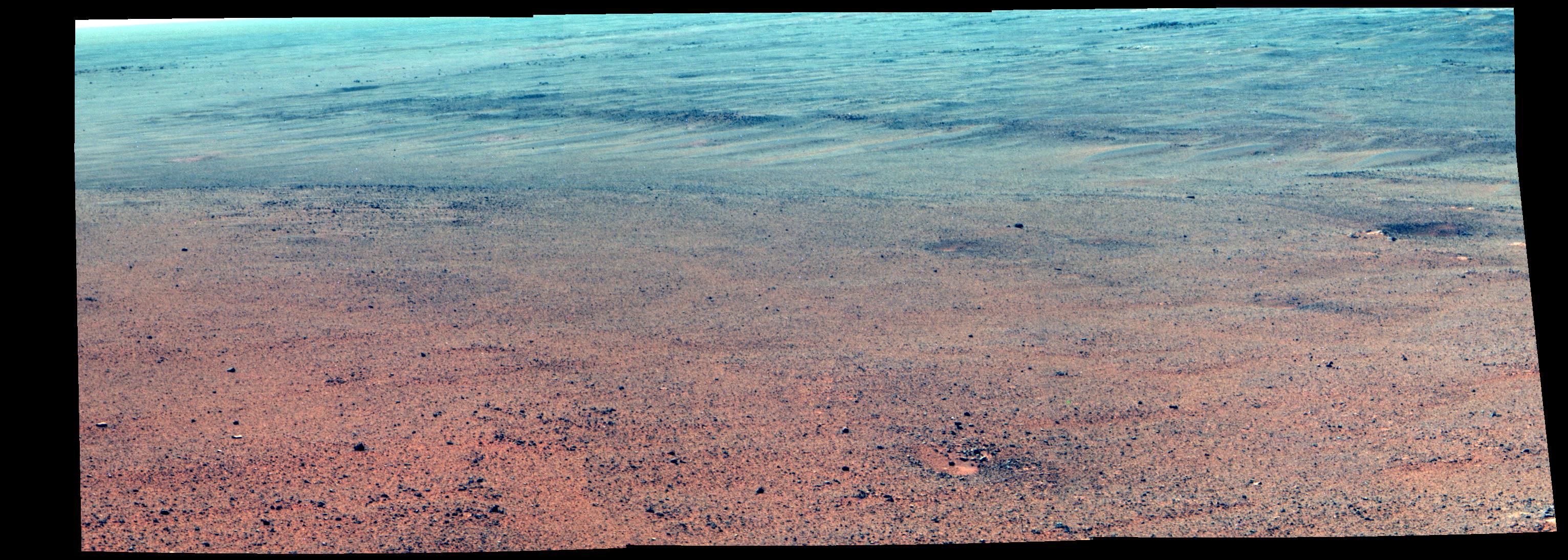 NASA's Mars Exploration Rover Opportunity took the component images of this enhanced-color scene during the mission's "walkabout" survey of an area just above the top of "Perseverance Valley," in preparation for driving down the valley.