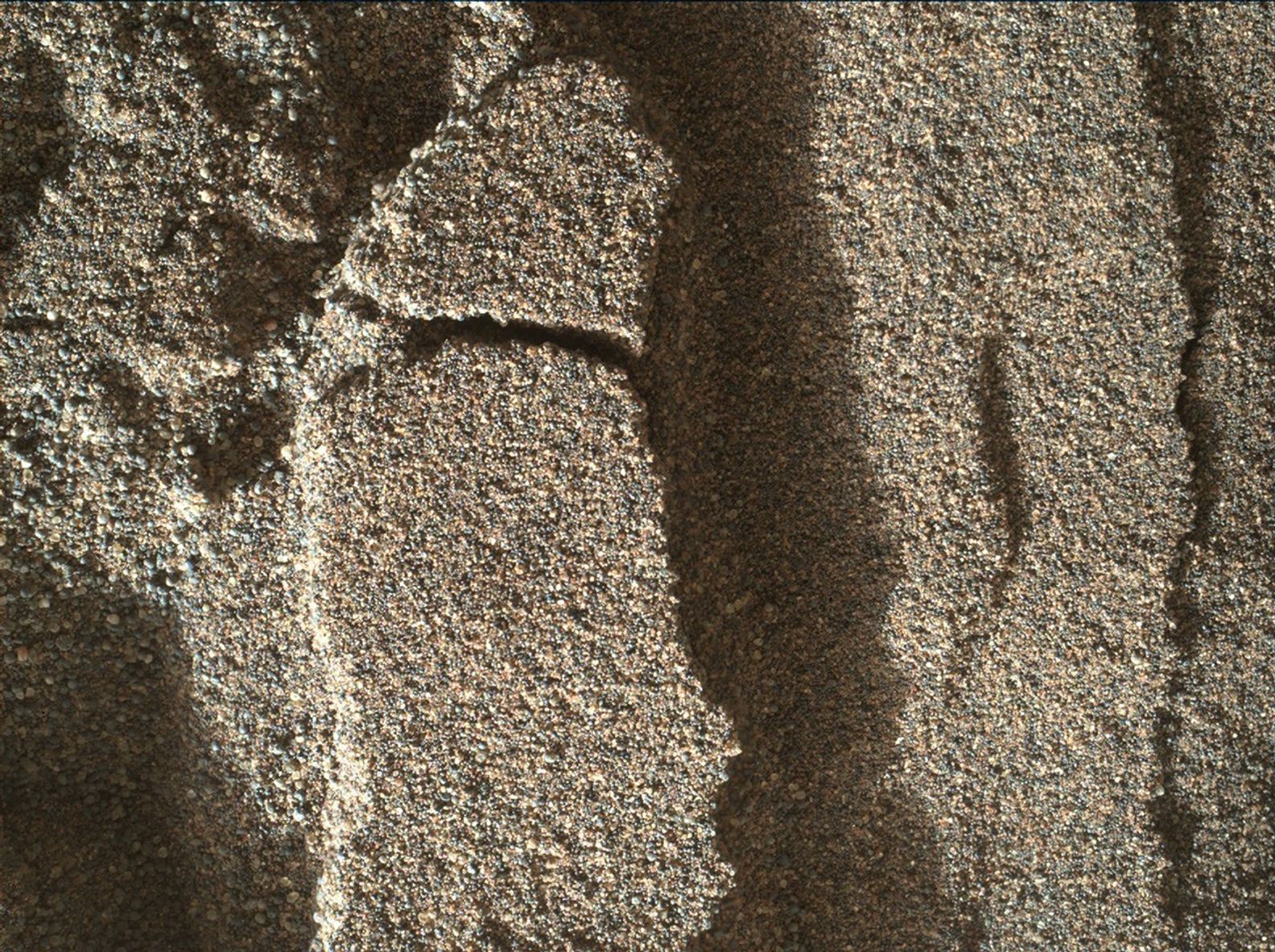 This view shows grains of sand where NASA's Curiosity Mars rover was driven into a shallow sand sheet near a large dune. The disturbance by the wheel exposed interior material of the sand body, including finer sand grains than on the undisturbed surface. Sunlight is coming from the left.