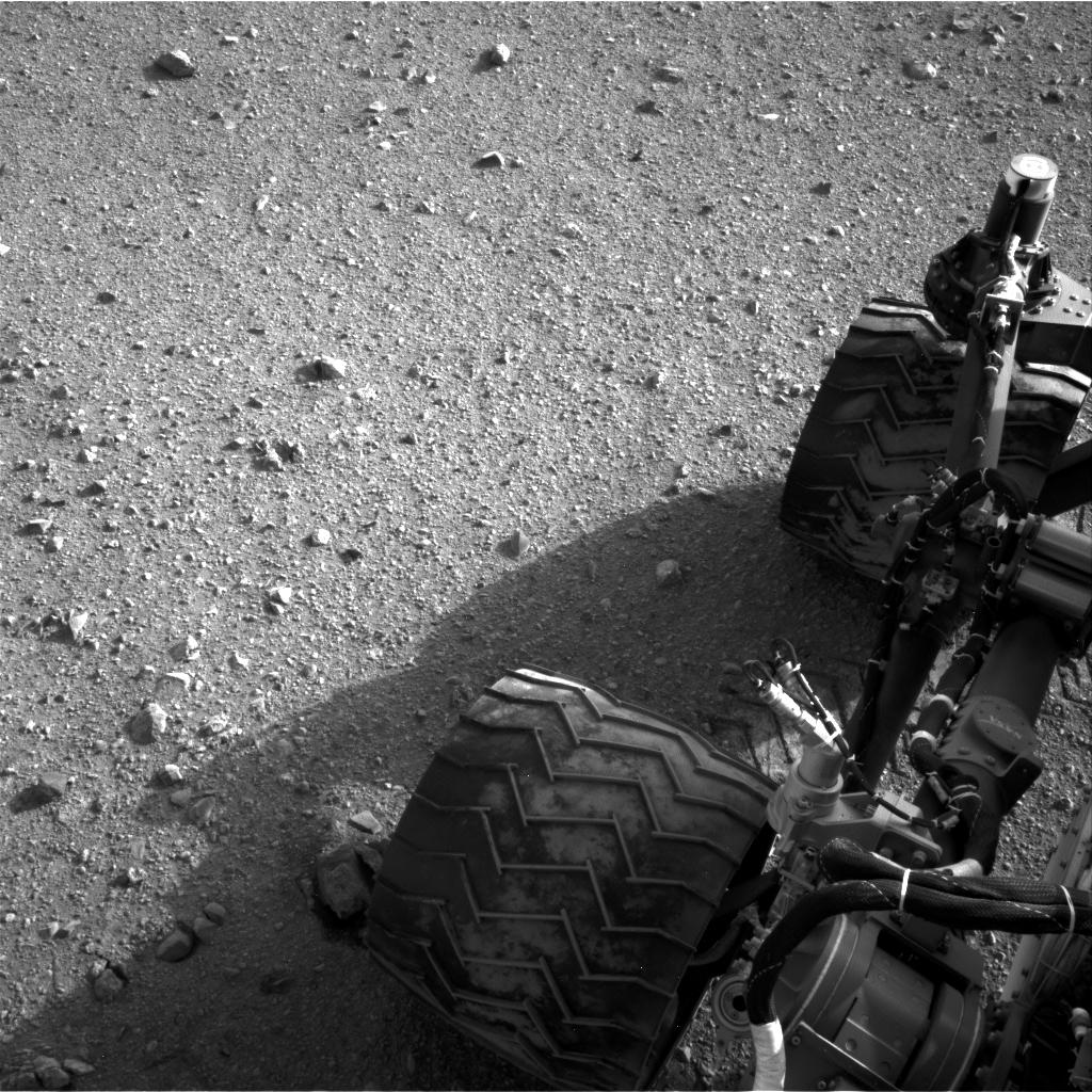 Soil clinging to the right middle and rear wheels of NASA's Mars rover Curiosity can be seen in this image taken by the Curiosity's Navigation Camera after the rover's third drive on Mars. The drive of about 52 feet (16 meters) during the 22nd Martian day, or sol, of the mission (Aug. 28, 2012), covered more ground than the two previous drives combined.